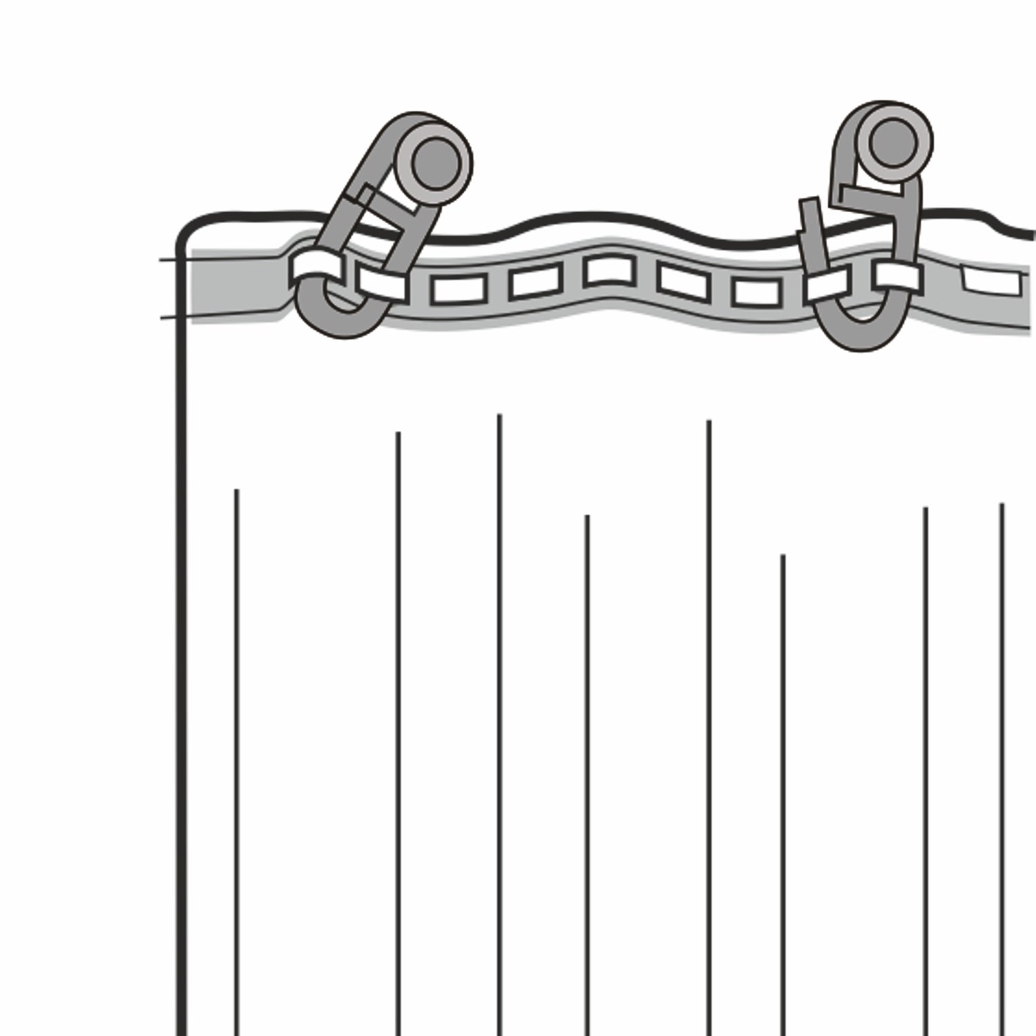 - Aufhängung mit Gardinenband: Aufhängung mittels Gardinenrollen oder -haken an der Gardinenleiste/Schienensystem